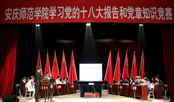 此次学习党的十八大报告和党章知识竞赛由党委组织部、党校、学工部、团委联合举办。通过4月24日预赛角逐胜出的机关一总支、机关二总支、文学院、外国语学院、政法学院、经济与管理学院、美术学院、数学与计算科学学院、化学化工学院、体育学院等10个代表队参加了决赛。本次知识竞赛决赛分个人必答题、集体必答题、抢答题和风险题四个环节进行,其中还穿插了观众互动环节。在必答题环节中,各代表队队员沉着应答、场上比分一度不分上下。抢答题环节竞争激烈、高潮迭起。风险题环节,题目分为10分、20分、30分三档,各支代表队选手们均准备充分、表现出色,不断博得观众喝彩。