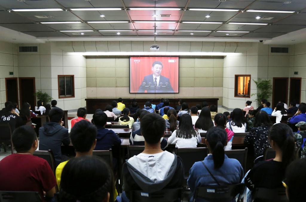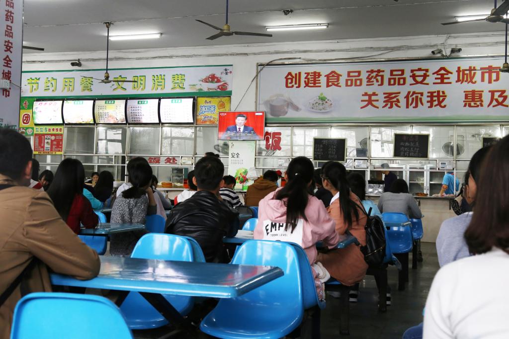 大会尚未开始,yl23455永利官网龙山校区食堂和行政楼一楼会议室已经坐满了师生,集体收看大会的电视转播。与此同时,许多师生还在家中、办公室、宿舍通过电视和互联网形式自发进行了收看。