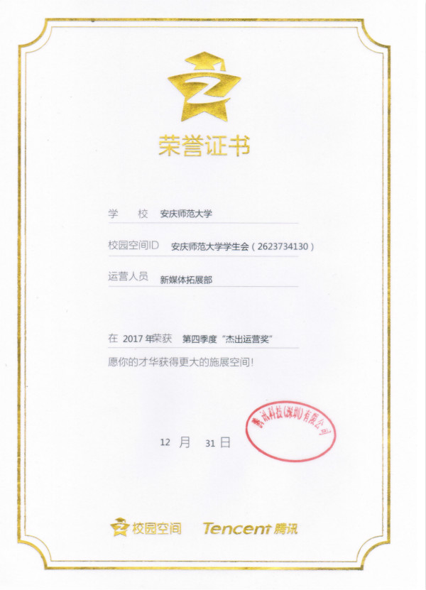 近日,由中国青年报、中国高校传媒联盟、腾讯科技联合举办的QQ智慧校园2017年度颁奖盛典在深圳腾讯总部举行。此次盛典以“智慧未来 无界连接”为主题,来自全国一百多所高校的师生代表参加会议。永利官网学生会QQ空间荣获腾讯校园空间“2017年度优秀校园空间”称号,全国仅有22所高校获此殊荣,这也是永利官网学生会QQ空间首次获得该项荣誉。