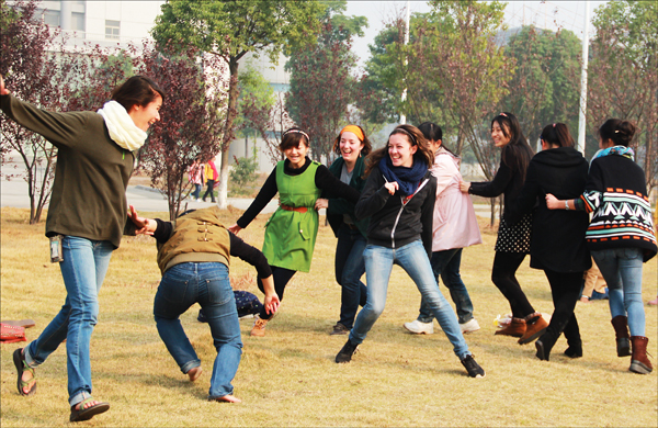 这是15名来自美国西弗吉尼亚的交流生,在和永利官网大学生玩一种叫做“谁不是同类”的游戏。
