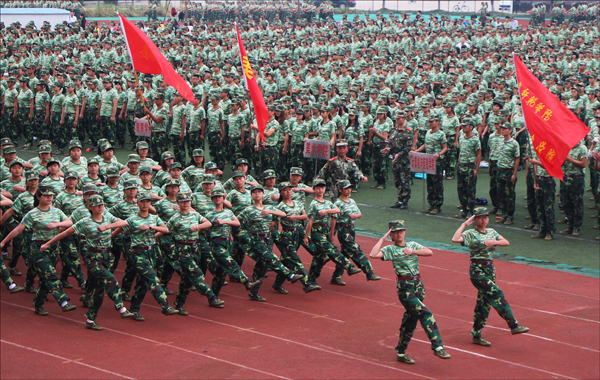 5611名参加军训的新生编制成1个军训旅、3个军训团、11个军训营、100个军训连,在操场上排成10个矩形方阵。面对党委书记何小祥的检阅,同学们齐声回答“首长好”、“为人民服务”。洪亮的声音,在龙山校区上空阵阵回荡。