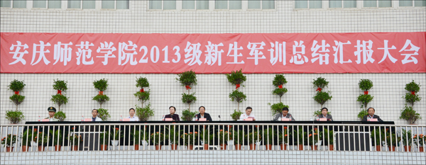 9月27日上午,安庆师范学院2013级新生军训总结大会在龙山校区塑胶运动场隆重举行。何小祥、朱士群、殷红、闵永新、汪时珍、刘友忠、陈光明、方锡球等校党政领导,武警安庆支队副政委黄俊出席大会。刘友忠副院长主持会议。