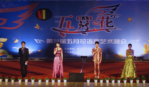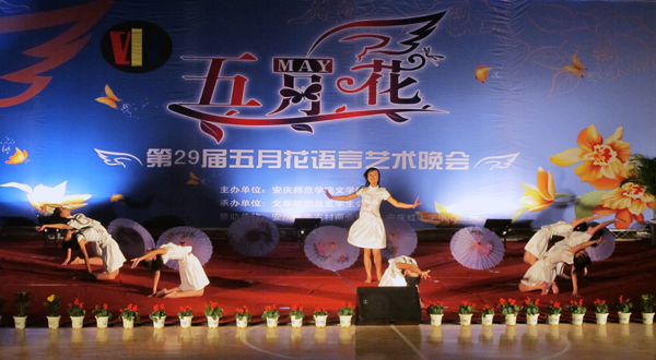 5月31日晚7点,安庆师范学院文学院第29届“五月花”语言晚会在体育馆盛大开幕。花团锦簇,夺目芬芳,五颜六色的灯光打在舞台中央立着巨大的深蓝色横幅上,犹如一朵含苞待放的花朵,绚丽婀娜,横幅上张开的翅膀载着年轻的梦在这方“红土”地上飘荡。校党委书记何小祥,党委副书记,院长朱士群,安徽省政协常委赵晓和,党委委员、副院长王海燕,党委副书记、纪委书记殷红,党委委员、副院长闵永新等领导与1000多名学生一起,共同享受这朵奇葩的绽放……