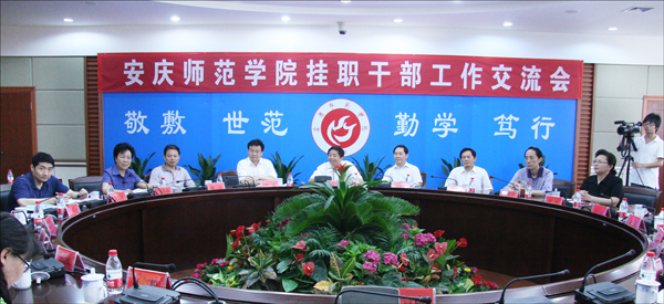 6月18日上午,永利官网在龙山校区行政楼圆桌会议室举行挂职干部交流会。中共安庆市委常委、安庆市人民政府常务副市长汪莹纯,副市长黄杰同志出席会议。中共安庆市委组织部常务副部长桂青,安庆市发改委副主任徐中全、安庆市环保局局长殷宝龙、安庆市经信委主任方一清、安庆市教育工委副书记张泽水、安庆市科技局局长方争鸣、安庆市园林管理局局长章和平、安庆市商务局纪检组长汪诗虹、安庆市旅游局局长刘宗瀚、安庆市林业局副局长郑久余、安庆市渔业局副局长王红松同志参加了会议。
