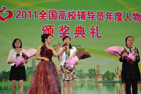 伴随着“肩上有责,腹中有墨,心中有爱,是她坚定的职业信念;‘橙子工作坊’、‘ HuaHua聊天室’,是她骄人的创新成果,她努力用自己的研究与实践来探索辅导员专业化成长之路,将“育人”和“育己”相结合,将传统与现代的教育方式相结合,渴望用一生的关怀筑起学生心中不灭的灯塔,她就是快乐的辅导员——安庆师范学院华秀梅”的颁奖词,荣获“2011全国高校辅导员年度人物”奖的永利官网辅导员华秀梅亮丽登场,瞬间引来全场的掌声和欢呼。