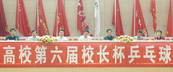 在激昂的国歌声中,安徽省高校第六届“校长杯”乒乓球赛隆重开幕。