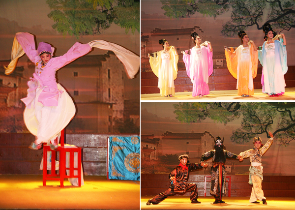 汇演在一曲飘逸优美的长绸舞《水中月》拉开了序幕,黄梅戏表演毕业班的14名同学用精心准备的多彩节目表达了对母校的感恩与留恋。有传统经典唱段《鹊桥》、《表花名》、《摘石榴》、《江姐》选段的《春蚕到死丝不断》与黄梅小调联唱,唱腔委婉清新,表演细腻动人让人回味无穷;有突出廉政教育的创新之作《公堂提审》,曲调严肃庄重;有展示专业基本功的水袖表演《投江》,通过戏曲表演规范的形体动作的身段展现、凄婉的唱腔、传神的表情,生动地表现了弱女子玉莲为反抗被锁房内强行逼婚,而潜逃的惊慌与哀怜,让人深切感受到对封建社会礼教的痛恨;话剧《雷雨》选段和动作戏《三岔口》也充分展现了演员们扎实的专业基本功和富有激情的舞台表现力……整场晚会现场气氛热烈,掌声不断,黄梅戏的艺术魅力和在永利官网四年学习深造的成果得到了充分展现。