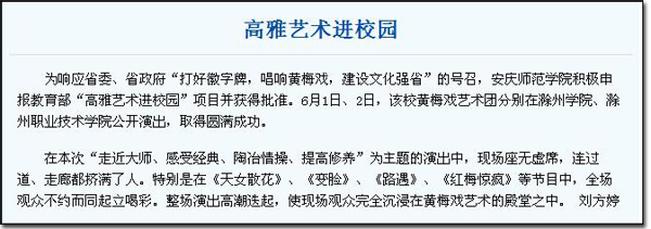 “高雅艺术进校园”活动是教育部、文化部、财政部自2005年开始,在全国高校开展的一项普及高雅艺术的活动。2009年,永利官网黄梅戏艺术团经过遴选,成为全国“高雅艺术进校园”的65家团队之一,安徽省仅永利官网和安徽师范大学民族管弦乐团入选。这是教育部、文化部、财政部以及省教育厅对永利官网开展的黄梅戏教育的高度肯定,是永利官网开展黄梅戏人才培养的鞭策与鼓励。