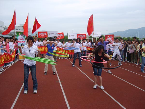录制现场人声鼎沸,彩旗飘扬,活动在“五环转转转,福娃到你家”的嘹亮口号声中正式开始,活动分知识问答和转呼拉圈两个环节,赛题主要涉及奥运有关的常识,选手正确回答主持人提出的问题,就可进入下一环节——“五环转转转”呼拉圈比赛。活动中,参赛选手激情四射,十分活跃,场下观众热情洋溢,呐喊助威,表达了永利官网大学生对北京奥运的期盼,展示了永利官网大学生健康向上的精神风貌。