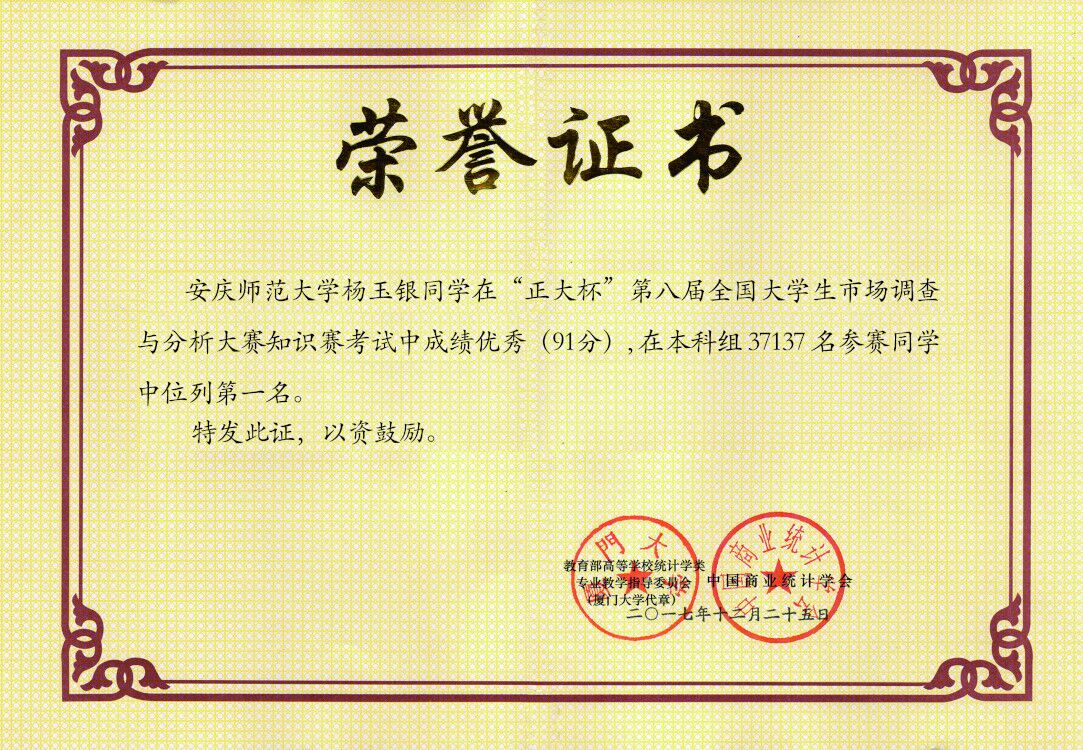 日前,“正大杯”第八届全国大学生市场调查与分析大赛知识赛成绩揭晓,永利官网2015级应用统计学2班杨玉银同学在本科组37137名参赛选手中位列第一名。