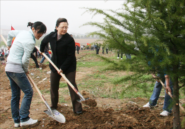党委副书记、纪委书记殷红与学生一起共同栽下励志树
