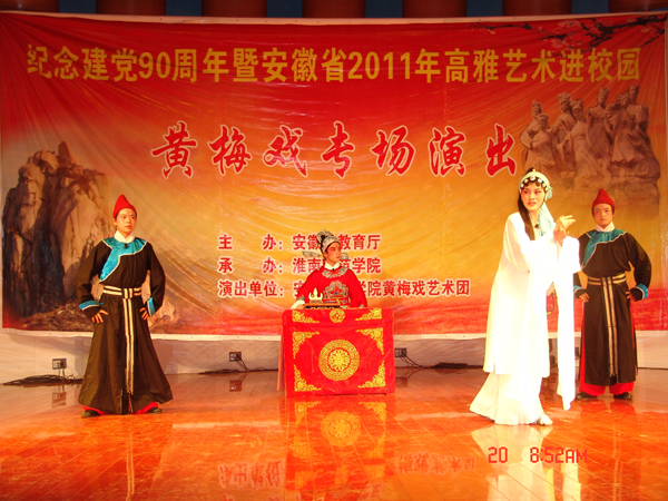 本次演出是根据安徽省教育厅2011年高雅艺术进校园活动的总体安排,由省教育厅主办,同时也是献礼建党90周年系列文艺演出。更为学生提供聆听经典、陶冶情操、提高艺术修养、提升文化品位搭建了更广阔的平台。(黄梅剧艺术学院)
