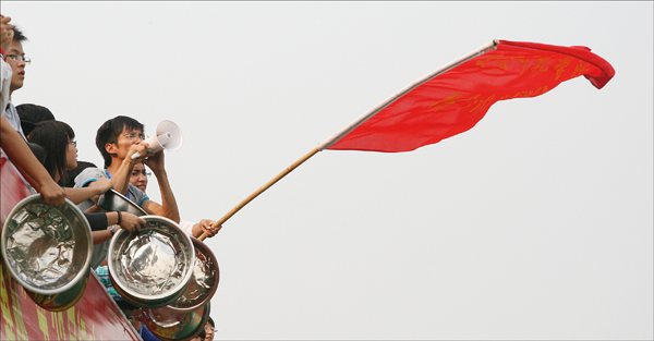 “啪——啪——”塑胶运动场外燃放起了庆祝的焰火,各个学院的运动员挥动着鲜红的院旗在跑道上奋力奔跑,欢呼声,呐喊声,鼓掌声响成一片。10月26日下午4时,龙山校区塑胶运动场成了欢乐的海洋。