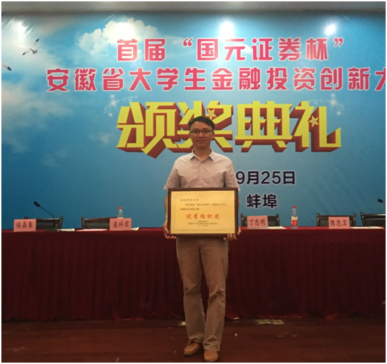 9月25日上午,首届“国元证券杯”安徽省大学生金融投资创新大赛颁奖典礼在安徽财经大学举行。安徽财经大学校长丁忠明教授,国元证券股份有限公司董事长蔡咏先生,安徽财经大学副校长陈忠卫教授,安徽省教育厅高教处副处长梁祥君博士,上海大智慧股份有限公司市场部副总经理李芬女士出席典礼并颁奖。永利官网经管学院金融工程教研室主任刘根节博士应邀出席此次典礼,并代表yl23455永利官网上台领取“优秀组织奖”。