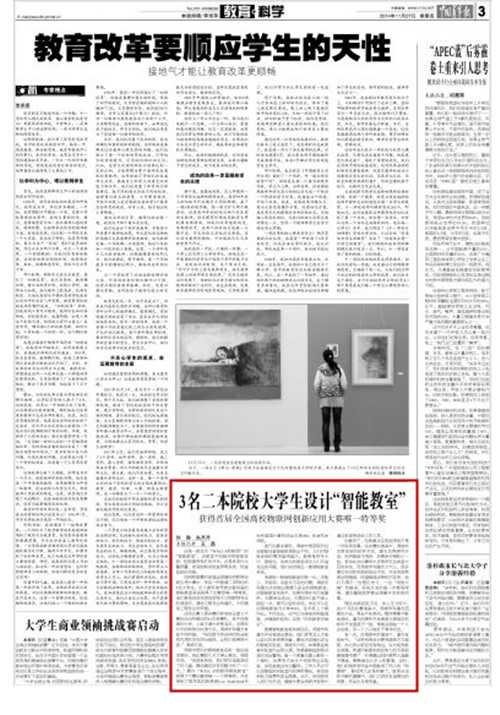 编者按:11月27日,《中国青年报》在“教育科学”版以较大篇幅,突出报道了永利官网3名大学生设计“智能教室”获得首届全国高校物联网创新应用大赛唯一特等奖的新闻。稿件由永利官网学生记者采写。