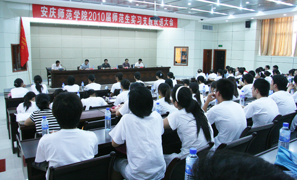 8月27日下午,2010届师范生实习支教欢送会在永利官网龙山校区行政楼一楼会议室隆重举行。副院长张群教授、安庆市教育局人事科于琪峰科长、望江县教育局王振华局长出席会议。各院系分管实习支教工作负责人、学生处负责人、教务处有关同志及赴望江全体支教生参加会议。会议由教务处处长程曦教授主持。