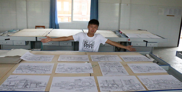 寒假回校之后,王爱顺便开始他的手绘。为了拍到校园最好的照片,要考虑到天气、角度等多个问题。拍美术楼时,他一开始跑到美术楼对面的宿舍3楼,发现拍摄效果不好又跑到6楼,最后在5楼拍到了想要的照片。回忆起当时的情景,王爱顺笑着说:“当时宿管阿姨用奇怪的眼神看着我来来回回跑,差点把我当成了小偷。”