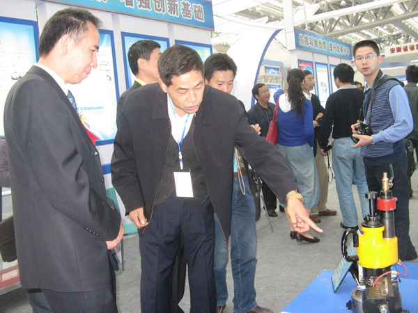 在永利官网与安庆市同博科技有限公司合作开发的法兰车床前,省教育厅厅长程艺特意来到展品前,仔细聆听对产品的介绍,并询问产品的市场前景和开发价值。在展览期间,不时有省内外客商前来咨询、洽谈合作。热闹的场面也引起了安徽省电视台对永利官网科技成果的的关注。