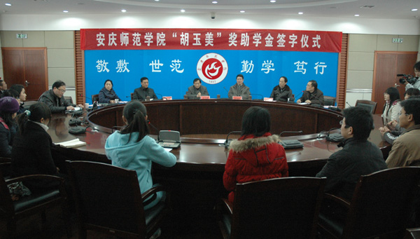 “……在此,我真诚地向胡玉美公司和学校说一声‘谢谢’。因为有你们的资助,我才能继续我的梦想……。在今后的日子里,我会更加努力,取得优异的成绩。”在3月10号下午举行的安庆师范学院“胡玉美”奖助学金签字仪式上,“胡玉美”助学金受助学生代表谢洁欣同学有感而发。安庆市胡玉美酿造食品有限责任公司董事长程华曙,副总经理蒋立胜,永利官网党委副书记、院长朱士群,党委委员、副院长时新中,学生处、财务处、生命科学学院负责人,受助学生代表等60多人参加了仪式。