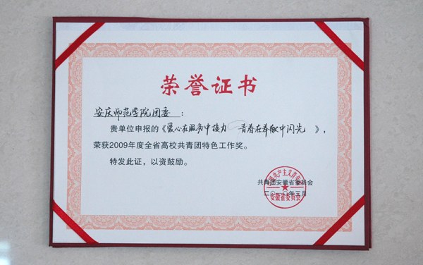 2009年,学校共青团工作在校党委的坚强领导下,在各院系、相关部门的支持下,坚持围绕中心、服务大局,以拓展学生素质、繁荣校园文化、增强团学组织活力为着力点,内强素质、外树形象,圆满地完成了年初制订的各项任务,取得了良好的工作成效。2009年,校团委完成了对500名学生骨干的马克思主义理论和实践教育,举办了青年马克思主义者培训班,开展了大学生责任教育、感恩教育和导航教育,组织了上万名学生奔赴各地开展了红红火火的暑期社会实践活动,安排了120名青年学生走进大10个村委、社区担任助理;开展了“强基层、固基础”的共青团基层组织建设工作,进一步强化基层团组织的组织建设、制度建设、活动建设,405个团支部开展了“我为祖国献青春”的主题团日活动,“举团旗、唱团歌、戴团徽”加强青年学生的团员意识教育;继续以提升学生综合素质为目的、打造学生成长成才平台,举办了12项大型活动和 68项专项活动和社团活动,学生在参加各类竞赛活动中,有222名同学获得省级以上奖项72项,其中,“挑战杯”竞赛取得历史性突破,获得全国二、三等奖,大学生艺术展演活动中,再获全国二、三等奖和全国“优秀组织奖”,永利官网学子黄金结荣获全国首届百名“大学生志愿服务西部计划优秀志愿者”荣誉称号(安徽省仅两人获选),学前教育专业07(1)班被团中央、教育部评选为全国先进班集体(是永利官网首个全国先进班集体)。(团委)