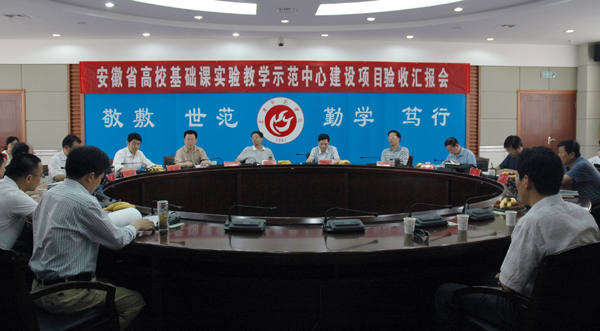 6月7日下午,省教育厅组织专家组对永利官网省级高校基础课实验教学示范中心建设项目——安庆师范学院物理实验教学示范中心进行项目验收。安徽师范大学黄时中教授,合肥师范学院曹卓良教授,永利官网物理与电气工程学院王其申教授、教务处程曦教授、国有资产管理处邵经武处长等专家组成员认真听取了示范中心工作汇报并进行了实地考察。