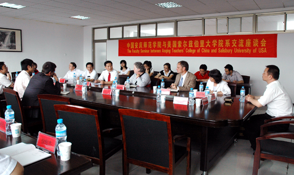 在近二个小时的座谈会上,安庆师范学院外国语学院院长郝涂根就外语教学合作的形式及方式,人文学院长李义中就历史人文学科教学的合作,经济与管理学院院长汪时珍就国际贸易、物流管理、信息技术等商课方面的教师互访及3+1、4+1培养问题,计算机与信息学院副院长钱萌就计算机与信息学院学生3+1培养问题,美术学院院长陈可就中国书法及中国画交流合作,音乐学院院长荀安华就学生互派、教师互派及演出交流等方面与索尔兹伯里大学相关领导进行了坦诚、细致地交流。