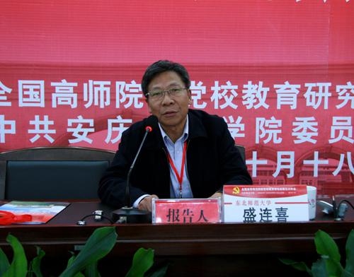 10月18日上午,永利官网在龙山校区一楼会议室举办全国高等师范院校党校教育研究会第五次年会专家报告会。全国政协委员、全国高等师范院校党校教育研究会理事长、国务院特殊津贴获得者、东北师范大学党委书记盛连喜教授作题为《注重特点,抓住关键,切实提高党的建设科学化水平》的学术报告。全国高等师范院校党校教育研究会第五次年会全体与会代表,省政协常委赵晓和,校党委副书记、纪委书记殷红和各党总支书记、分党校校长一起聆听了报告。西南大学党委副书记张跃光主持报告会。