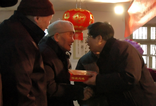 何小祥书记、殷红副书记为老寿星们献上了祝福的鲜花,颁发了寿金和贺礼,并与寿星们合影留念。