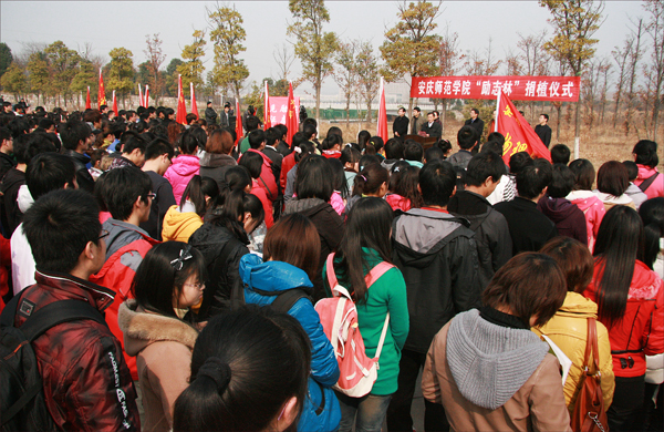 3月11日上午,在龙山校区的翱翔桥东南侧,学校隆重举行了“励志林”捐植仪式。校党委书记何小祥,党委副书记、院长朱士群,党委委员、副院长时新中,党委副书记、纪委书记殷红,党委委员、副院长闵永新,副院长张群、党委委员、副院长汪时珍,党委委员、办公室主任刘友忠等领导出席,各学院、相关职能部门的老师以及200余名学生代表参加。时新中副院长主持仪式。