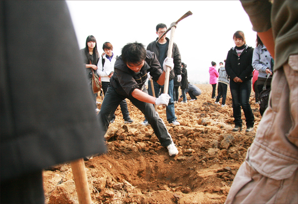 在简短的仪式之后,全体校领导和广大师生一起进行了植树活动。他们挖凼、培土、浇水,整个现场热火朝天。校领导一边铲土,一边向身边的同学询问学习、生活情况。很快,二十来棵香樟就树了起来。各学院的领导、老师纷纷邀请校领导和他们一起,在种植的香樟前合影留念。一些学院的学生还打起院旗,在“励志林”的石碑前留影。