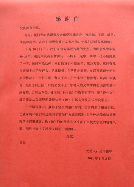 5月3日下午,党委宣传部收到安庆市一位老同志寄来的感谢信,叙说了永利官网音乐学院几位同学在“五一”假期灵山石树游玩期间热心助人的感人事迹。