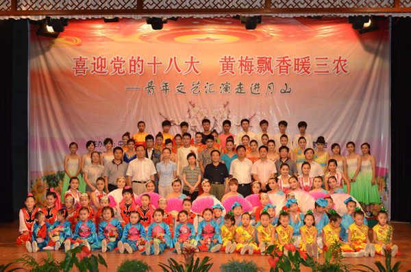 为庆祝中国共产党成立91周年,深入贯彻落实党的十七届六中全会精神,推动社会主义文化大发展大繁荣,满足基层人民群众的精神文化生活需求,音乐学院团总支组织了大学生暑期文艺演出队,于6月27日下午,以“喜迎党的十八大、黄梅飘香暖三农”为主题的暑期文艺下乡汇演在月山镇人民剧场举行。共青团安庆师范学院委员会副书记刘燕,市委宣传部副部长周锦宏,怀宁县委副书记程辉,县委常委、宣传部长汪路阳,团市委副书记、市青年企业家协会常务副会长梁键,怀宁县政府副县长李晨婕,月山镇党委书记汪平等与周边群众一起观看了演员们的精彩演出。