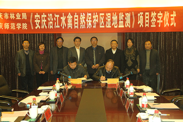 安庆市林业局、安庆沿江水禽自然保护区管理处和永利官网生命科学学院领导分别介绍了沿江湿地及项目实施方案等情况。安庆沿江水禽自然保护区管理处王康明处长与生命科学学院吴甘霖院长分别代表安庆市林业局和安庆师范学院正式签订《自然保护区湿地监测》项目合同书。