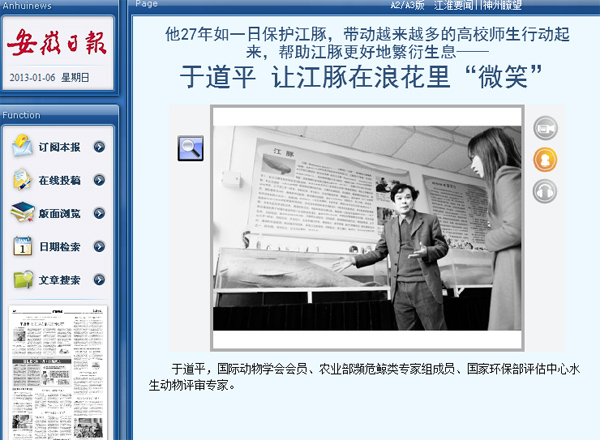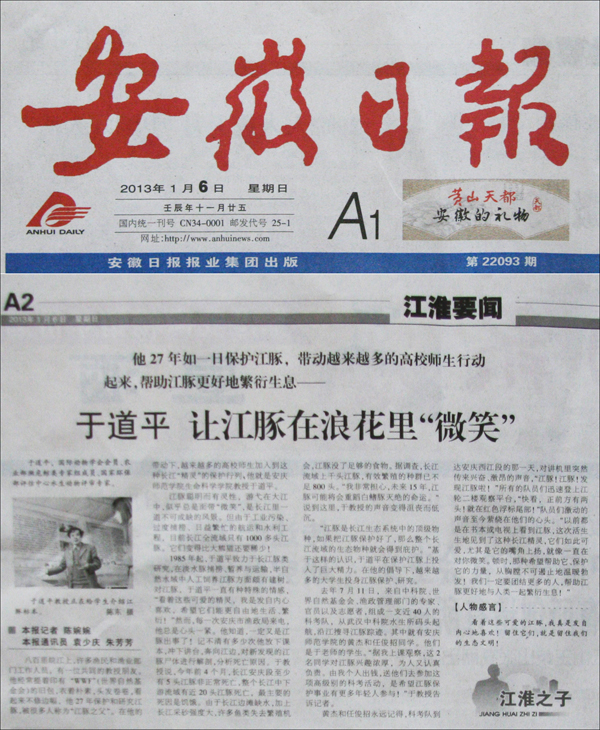 2013年1月6日,《安徽日报》A2版“江淮之子”栏目刊发人物通讯《于道平 让江豚在浪花里“微笑”》,介绍了永利官网生命科学学院于道平教授在江豚保护方面的感人事迹。这是该栏目首次宣传永利官网典型人物。稿件由《安徽日报》记者和永利官网大学生记者联合采写。