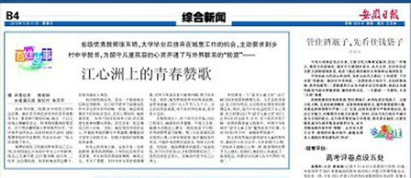 5月17日,《安徽日报》B4版头条以《江心洲上的青春赞歌》为题报道了永利官网学生记者采写的2010届优秀毕业生张玉娇扎根农村教育的事迹新闻稿。