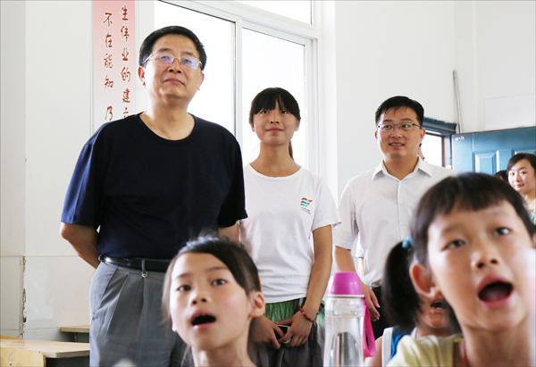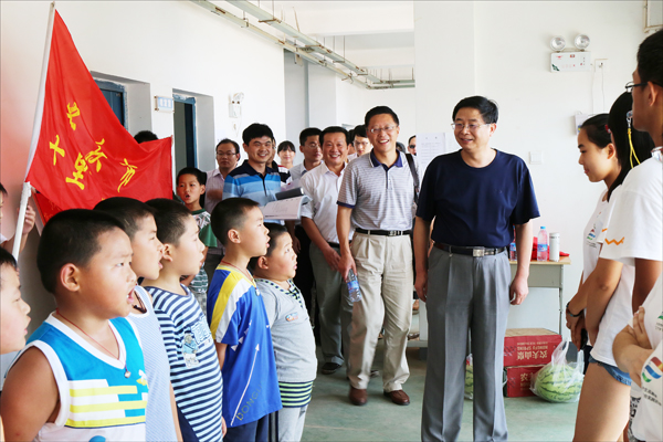 7月12日上午,校党委书记何小祥、副院长闵永新在宣传部、团委、外国语学院负责同志的陪同下,冒着酷暑,赴安庆市大观区十里中心学校调研基层教育需求情况,慰问永利官网2013年大学生暑期“三下乡”国家级重点团队——“七彩课堂”教育帮扶实践团全体成员。安庆市大观区区委常委、组织部部长曹立奇,区教育局、团区委和十里中心学校负责同志陪同调研和慰问。