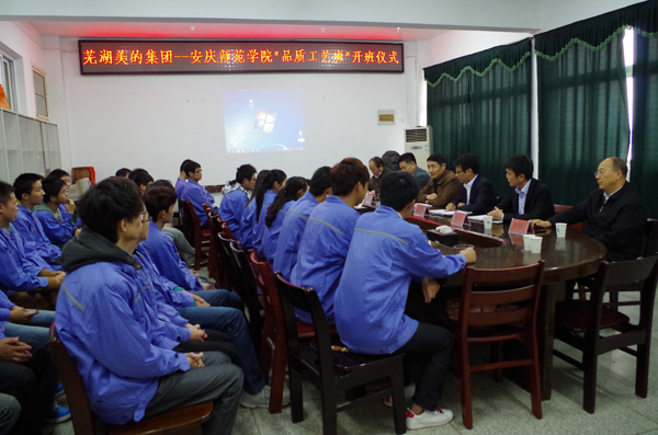 芜湖美的制冷设备有限公司副总经理陈小胜就“品质工艺班”的定位、企业要求作了热情洋溢的动员讲话。他指出,“品质工艺班” 定位于构建校企联合培养应用型人才的平台,其目的是为企业培养基层管理和技术人员,并为学员直接提供上升通道,希望各位学员端正态度,调整心态,充分认识到校企之间管理的差异性,严格遵守企业各项规章制度。