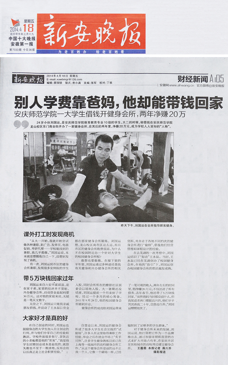 4月18日,《新安晚报》在“财经新闻”版大篇幅地报道了永利官网体育教育专业10级学生刘国运的成功创业事迹。晚报使用了“别人学费靠爸妈,他却能带钱回家”这一标题,表达了对刘国运“借钱开健身会所,两年净赚20万”这种创业精神和成功经历的赞誉。当天,安徽门户网站万家热线也采用文章加组图的形式,生动展示了刘国运创业之路上的精彩画面。此外,凤凰网在“凤凰资讯”版块对此新闻进行了转载。