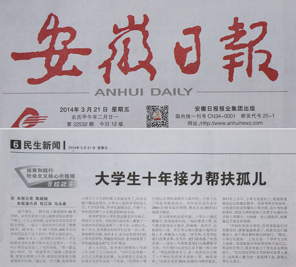 3月21日,《安徽日报》在“民生新闻”版头条“培育和践行社会主义核心价值观百姓故事”专栏刊登由永利官网学生记者采写的新闻《大学生十年接力帮扶孤儿》。文章记录了永利官网600多名大学生十年间始终坚持帮扶孤儿小琴的感人故事。文章一经刊出,人民网、网易、中国网、中国文明网等重大门户网站纷纷转载刊登,在社会上产生了积极影响。(宣传部)