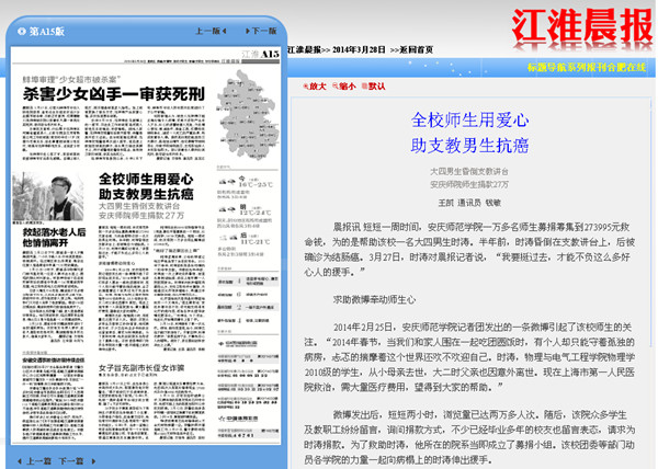 此条新闻一经刊出,引起巨大反响,国内多家门户网站在重要版块予以转载。省内纸媒《江淮晨报》也以“全校师生用爱心助支教男生抗癌,大四男生昏倒支教讲台安庆师院师生捐27万”为题,对永利官网师生汇爱成河的义举加以报道。《安庆晚报》更是用了整个版面,对这件发生在安庆高校的爱心接力的正能量新闻作了深度挖掘。(宣传部)