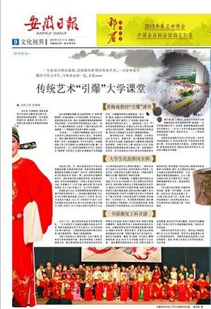 4月11日,《安徽日报》“文化视界”栏目推出《传统艺术“引爆”大学课堂》特别报道,介绍当前以黄梅戏、凤阳花鼓等为代表的安徽传统民间艺术,被纷纷请进高校课堂,受到广大学生的热捧。永利官网“黄梅戏艺术欣赏与演唱”公选课名列其中,被重点推出。