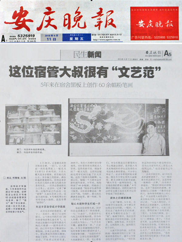 4月11日,《安庆晚报》“民生新闻”专版对冯圣祥大爷的事迹用整版的篇幅进行了报道,冯大爷的风采和他的“代表作”也赫然走出宿舍楼,走出校门,登在了晚报上。不仅如此,从安徽门户网站的万家热线到人民网、新华网,都对永利官网这位颇具“文艺范”的宿管大爷的才艺、精神“青眼有加”,报道、转载了这篇人物通讯。