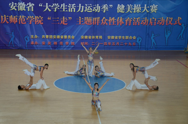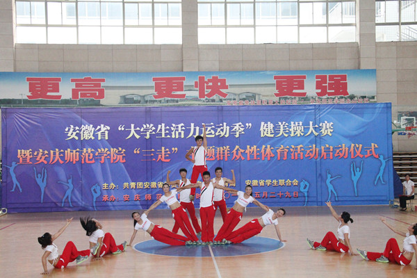 5月29日上午,安庆师范学院体育馆内歌声嘹亮,激情飞扬。安徽省“大学生活力运动季”健美操大赛暨安庆师范学院“三走”主题群众性体育活动启动仪式在这里隆重举行。校党委委员、副院长闵永新,共青团安徽省委学校部副部长刘存磊,共青团西藏自治区委员会青工部副部长秦琳、安庆职业技术学院副院长毕明生出席大赛开幕式。黄山学院等兄弟院校有关负责同志、永利官网各学院党总支负责人、校团委等有关部门负责同志和数百名学生代表一起观看了比赛。来自安徽师范大学、淮北师范大学、合肥师范学院、黄山学院、滁州职业技术学院、安庆职业技术学院和安庆师范学院等高校的7支代表队参加了比赛。