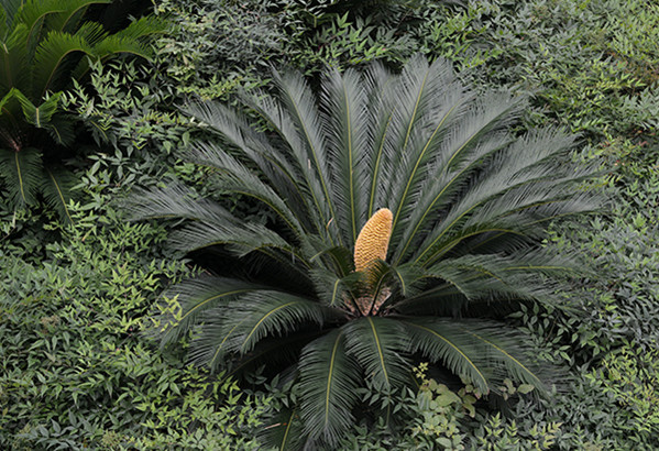 永利官网行政楼花园内这棵铁树有1.5米高,铁树的嫩叶中心可以看到一枝黄色的“花蕾”,似一枚金黄色的大玉米芯,有30厘米高,直径约20厘米。