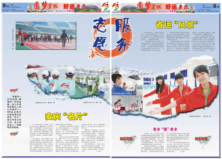 编者按:目前,省十三运高校部田径比赛在永利官网龙山校区激战正酣,众多媒体也将目光投向了这里。《安庆日报》开赛以来每日均登载由永利官网学生记者供稿的赛事通讯。10月11日出版的《安庆晚报》十三运专刊采用了陈东及学生记者拍摄的校园体育和志愿者11幅摄影作品。