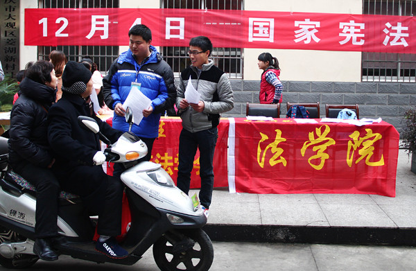 当天上午,由近百名法学院学生组成的10支小分队,从学校出发走进农村、社区、学校和车站宣传宪法知识。