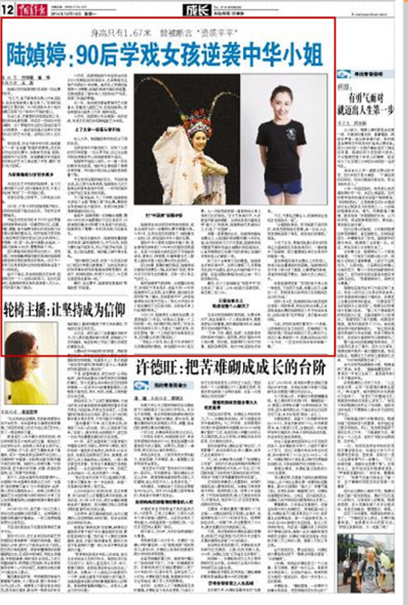 编者按:12月15日,《中国青年报》在“成长”版块大篇幅刊登获得“2015年国际中华小姐内地赛区冠军”的永利官网毕业生陆媜婷的人物通讯。稿件由永利官网学生记者采写。