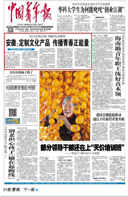 编者按:10月27日,《中国青年报》在头版头条的显著位置,刊登了大篇幅反映永利官网“三修”育人工程的通讯文章《突出实践引领 创新活动载体:安徽 定制文化产品 传播青春正能量》。永利官网共青团紧紧抓住青年思想引领的战略任务,立足学校工作实际,以社会主义核心价值观为统领,以“三修”为路径,以“四成”为目标,将社会主义核心价值观内化为大学生修身教育的具体内容,精选路径,创新项目,微媒互动,扎实推进,实现了工作的全员化、项目化、名师化和长效化。
