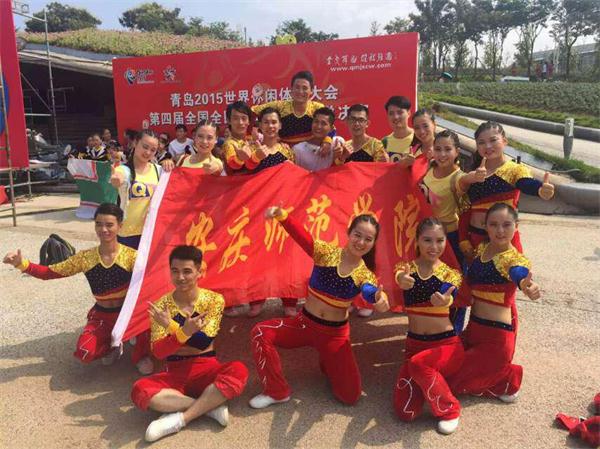 9月17日,体育学院健美操队在潮芳和王云辉两位老师的带领下,参加了在青岛世博园举办的2015年世界休闲体育大会“青岛世博园”第四届全国全民健身操舞大赛总决赛,并最终夺得包括五个特等奖、五个一等奖在内的多个奖项。