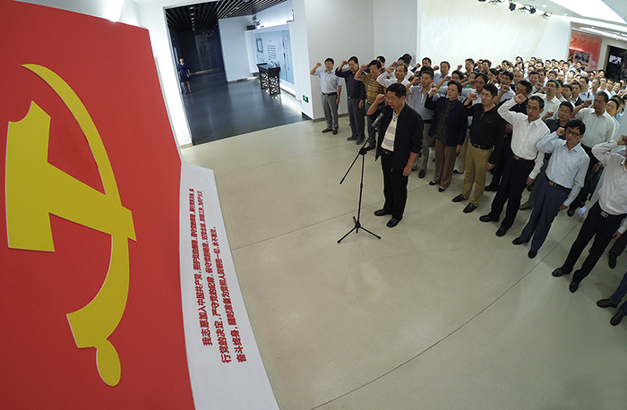 在党委书记何小祥带领下,大家面向鲜红的党旗,庄严地举起右手,重温入党誓词。铿锵恢宏的誓词,久久激荡在每位党员的心中,表达了对党的无限忠诚和为党的事业奉献终身的坚定信念。